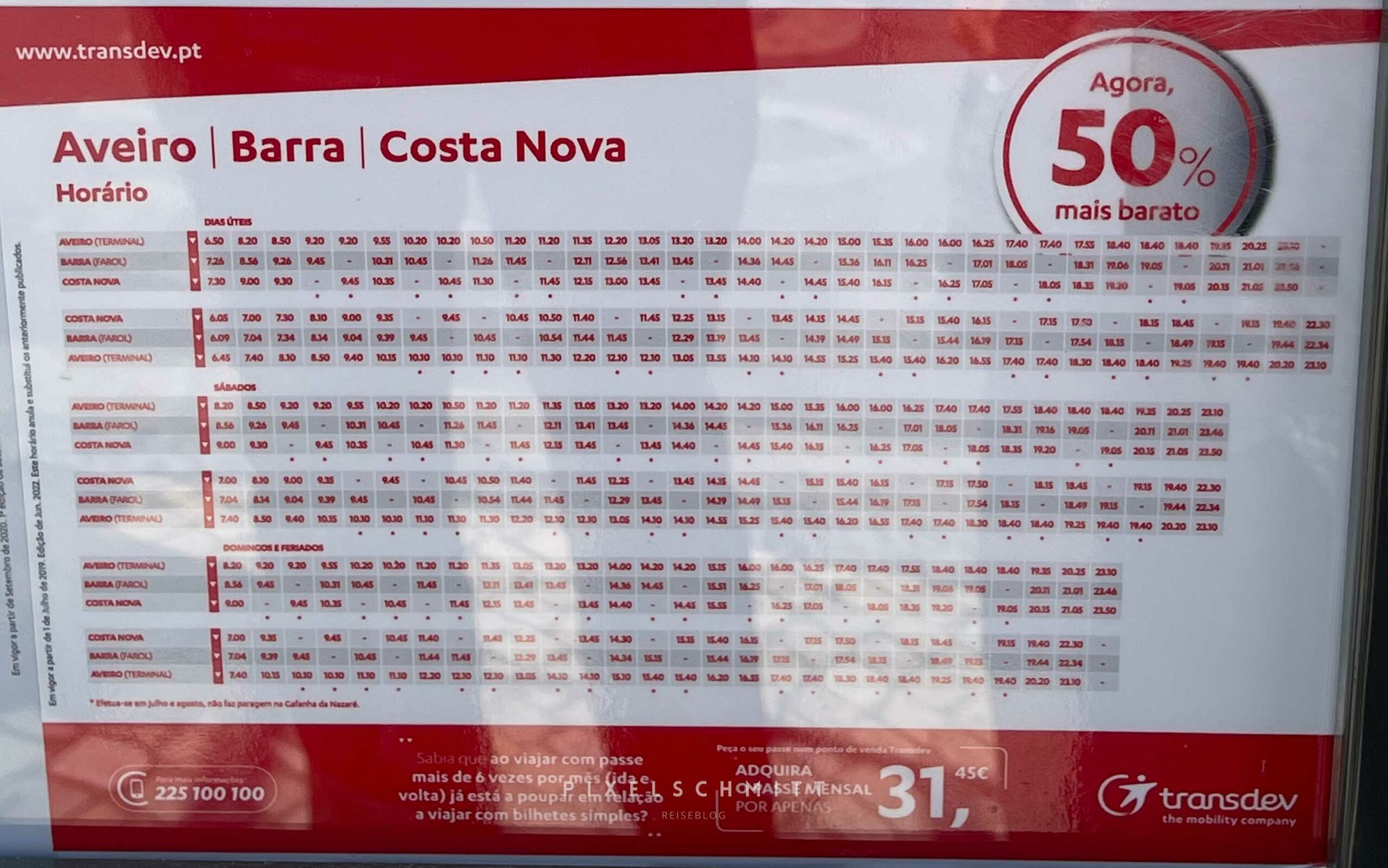 Die genauen Abfahrtzeiten findest du auf der Website der Buslinie unter https://www.transdev.pt/horarios/aveiro