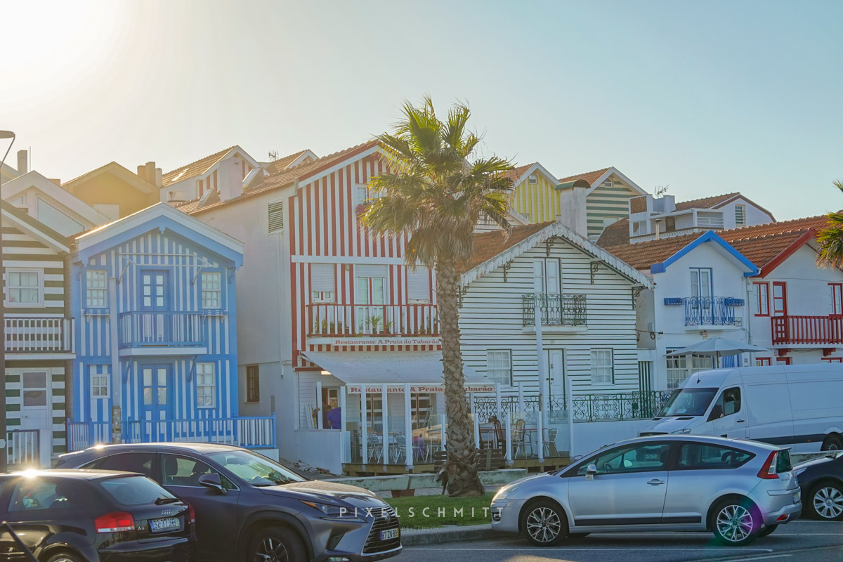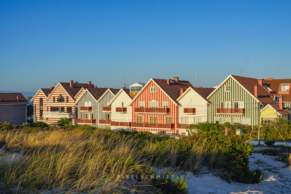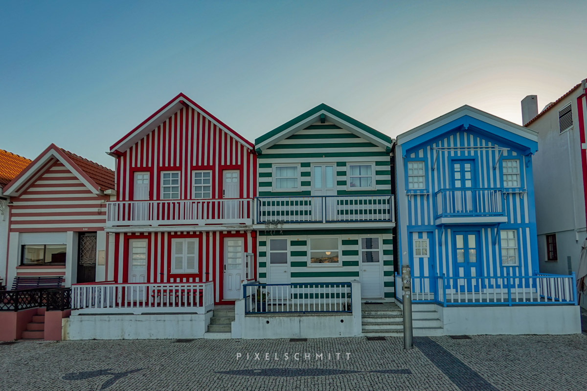 Wenn du die gestreiften Häuser schön fotografieren willst, dann komme am Morgen nach Costa Nova. Die schönsten gestreiften Häuser stehen an der Ostseite der Landzunge. Morgens hast du schön weiches Licht und die Farben leuchten richtig.